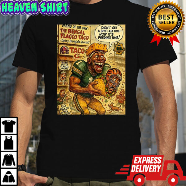 Cincinnati Bengals vs Green Bay Packers NFL 2025 The Bengal Flacco Taco caricature shirt, Classic, Women’s, Long Sleeved, Sweatshirt and Hoodie