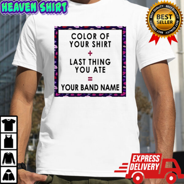Elevate your wardrobe to new heights with our exclusive Color of your shirt last thing ate your band name shirt. Don’t settle for mediocrity when you can own a piece of art that speaks volumes without saying a word. Embrace the attention, the compliments, and the confidence that come with wearing something truly exceptional. Be the showstopper, the head-turner, the one who sets the bar high. Upgrade your fashion game and let your outfit do the talking. Dare to be different, dare to be bold – because you deserve to stand out in a crowd. Make a statement, make an impact, make it yours today!