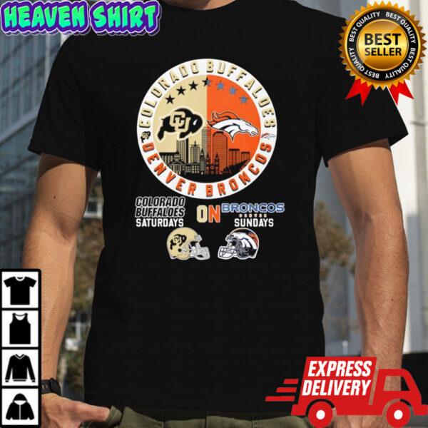 Get ready to show off your dual team spirit with our exclusive Colorado Buffaloes on Saturdays and Denver Broncos on Sundays helmet logo mashup shirt. This innovative design combines the iconic logos of both teams into a striking mashup that is sure to turn heads wherever you go. Whether you’re cheering on the Buffaloes at the stadium on Saturdays or supporting the Broncos on Sundays, this shirt is the perfect way to express your love for both teams in a unique and stylish manner. Crafted from high-quality, soft fabric, this shirt ensures comfort all day long, making it ideal for game days, tailgates, or casual outings with fellow fans.