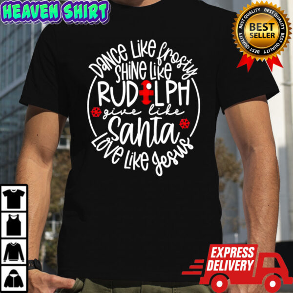 Dance Like Frosty Shine Like Rudolph Give Like Santa Love Like Jesus shirt, Classic, Women’s, Long Sleeved, Sweatshirt and Hoodie