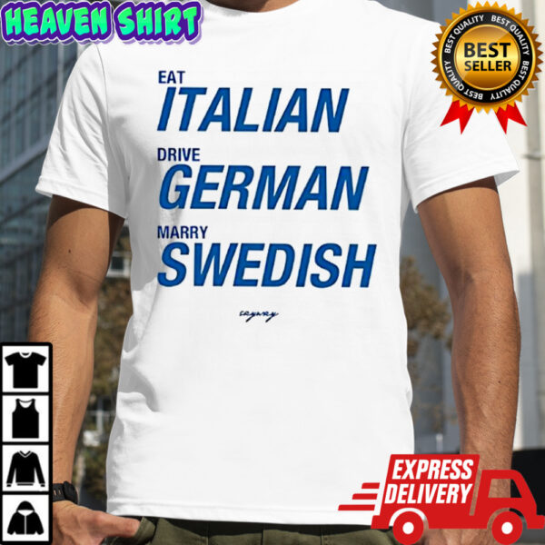 Indulge in a sense of international flair with our Eat Italian Drive German Marry Swedish Shirt. This unique garment embodies the essence of cultural fusion and sophistication. Crafted with the finest materials, it exudes quality and style that transcends borders. The design seamlessly blends the passion of Italian cuisine, the precision of German engineering, and the elegance of Swedish traditions. Whether you are a globetrotter or simply appreciate the beauty of diverse cultures, this shirt is a statement piece that celebrates the best of European heritage.