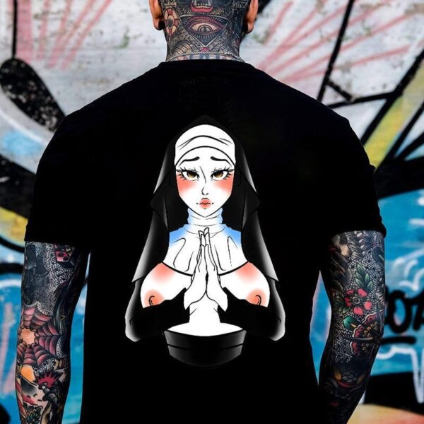 Immerse yourself in the allure of the Enchanting and Sexy Nun Praying Black Print T-shirt and embrace the power of individuality. Crafted from high-quality, soft fabric, this t-shirt not only looks stunning but also feels incredibly comfortable to wear. The bold print is fade-resistant and durable, ensuring that your style remains vibrant and eye-catching wear after wear. Elevate your wardrobe with this unconventional piece that challenges norms and sparks intrigue. Make a statement, express your unique personality, and let your fashion choices reflect your inner confidence. Don’t miss out on the opportunity to own a piece that is as enchanting as it is daring – redefine your style with the Enchanting and Sexy Nun Praying Black Print T-shirt today!
