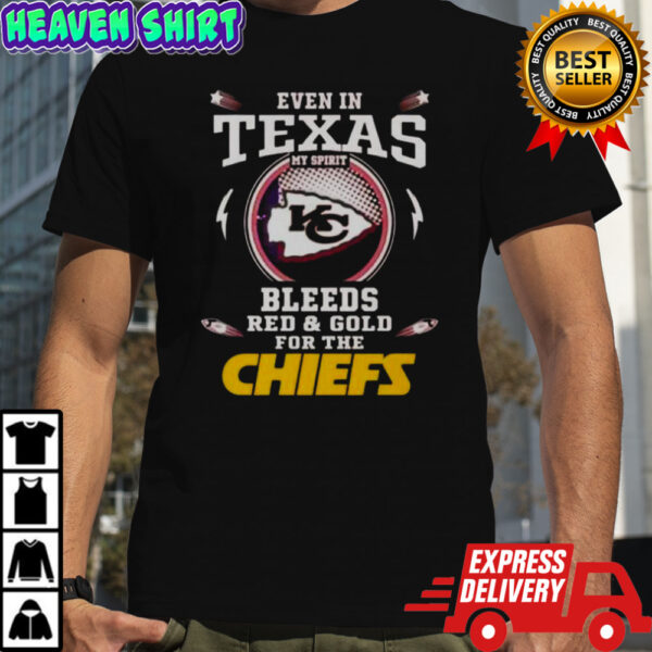 Even In Texas My Spirit Bleeds Red And Gold For The Kansas City Chiefs T-Shirt, Classic, Women’s, Long Sleeved, Sweatshirt and Hoodie