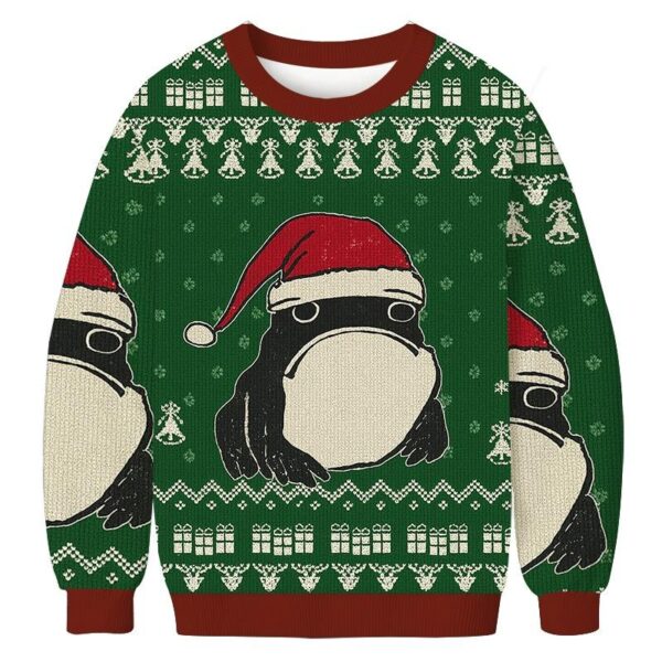 The Frog Wearing Santa Hat Green Christmas Ugly Sweatshirt is not your typical holiday attire. This whimsical garment brings a touch of festive cheer with a fun twist. Picture a charming frog donning a Santa hat, set against a vibrant green backdrop. The design is perfect for those looking to stand out at ugly Christmas sweater parties or spread joy during the holiday season. The playful combination of a beloved seasonal icon with an unexpected twist is sure to spark conversations and bring smiles wherever you go. Embrace the spirit of the season with this unique and eye-catching sweatshirt that embodies the essence of fun and celebration.