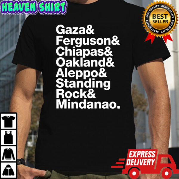 In a world where every thread tells a story, the Gaza Ferguson Chiapas Oakland Aleppo Standing Rock and Mindanao shirt weaves a narrative of unity and strength. Crafted with the finest cotton, this shirt symbolizes solidarity with communities across the globe. Each stitch carries the resilience of Gaza, the passion of Ferguson, the spirit of Chiapas, the activism of Oakland, the endurance of Aleppo, the courage of Standing Rock, and the hope of Mindanao. Wearing this shirt isn’t just about fashion; it’s about wearing your values on your sleeve and standing tall for justice.