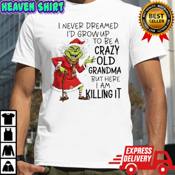 Grinch Christmas i never dreamed i’d grow up to be a crazy old grandma but here i am killing it shirt