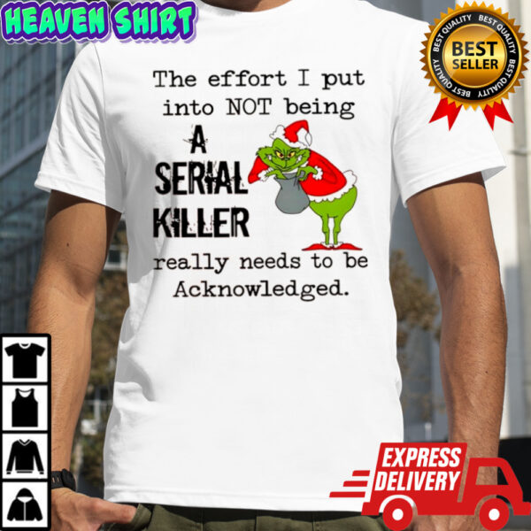 Embrace the holiday spirit with our exclusive Grinch Christmas the effort i put into not being a serial killer really needs to be Acknowledged shirt. This festive shirt is not just apparel; it’s a statement of your unique style and humor. The vibrant colors and intricate design capture the essence of the holiday season while adding a touch of whimsy to your wardrobe. Made from high-quality, soft cotton, this shirt ensures comfort all day long, whether you’re attending a holiday party or lounging at home. Stand out from the crowd and spread some holiday cheer with this eye-catching shirt that celebrates the Grinch in all of us.