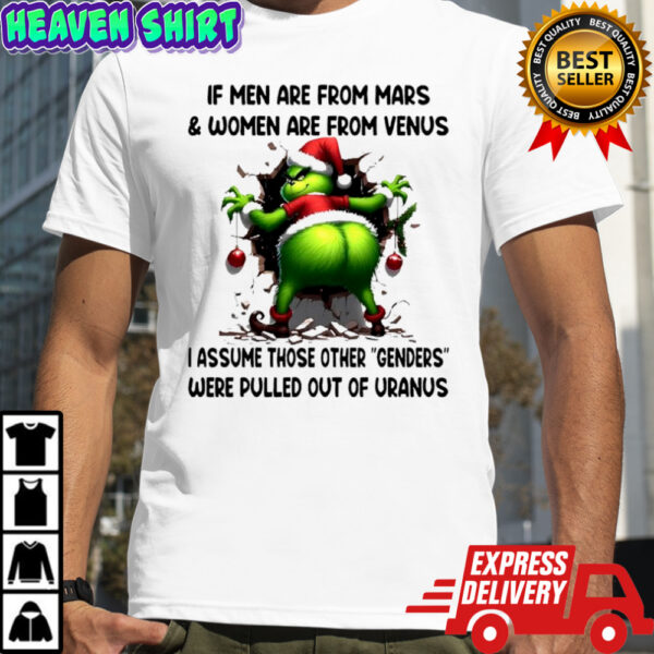 Embrace your individuality and stand out from the crowd with the Grinch if men are from mars & women are from venus i assume those other genders were pulled out of uranus shirt. This shirt is not just a piece of clothing; it’s a statement, a reflection of your fun-loving and carefree spirit. Imagine the smiles and chuckles you’ll elicit from friends and strangers alike when they catch a glimpse of this amusing shirt. Don’t miss out on the opportunity to add a dash of humor to your everyday attire. Get your hands on the Grinch if men are from mars & women are from venus i assume those other genders were pulled out of uranus shirt today and let your personality shine through your style!