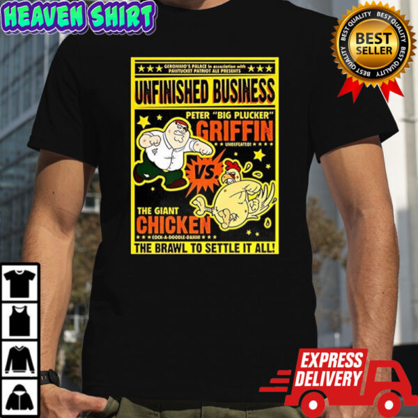 Experience the nostalgia and humor of Family Guy like never before with our premium Peter Griffin vs giant chicken Unfinished Business cartoon poster shirt. Made from high-quality, soft fabric, this shirt offers comfort and style in one package. Whether you’re binge-watching your favorite episodes or hanging out with friends, this shirt is the perfect choice to showcase your love for the series. Don’t miss out on the chance to own a piece of television history – grab your own Peter Griffin vs giant chicken shirt today and let your wardrobe reflect your fun-loving personality!