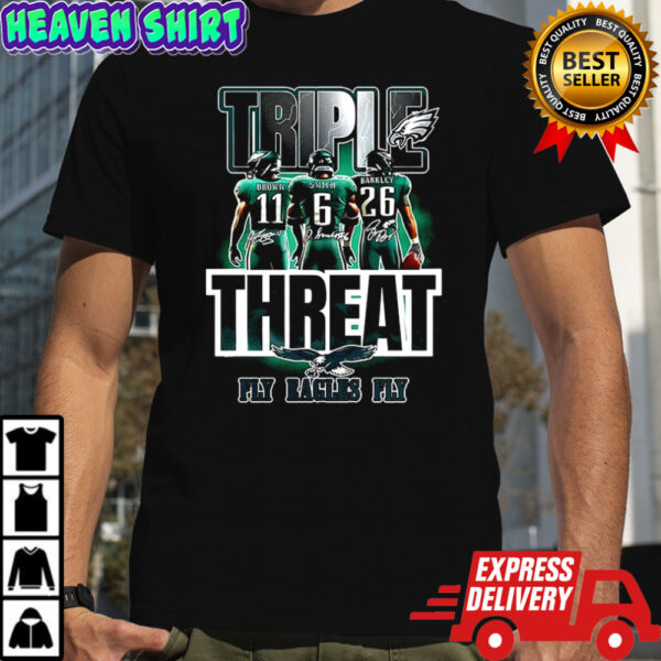 Elevate your fan game to the next level with the Philadelphia Eagles NFL 2025 Triple threat Fly Eagles Fly signature shirt. Feel the excitement of game day every time you put on this shirt. Show the world your support for the Eagles and celebrate each touchdown in style. Donning this shirt not only boosts your team spirit but also connects you with a community of passionate fans. Don’t miss out on the opportunity to own this limited-edition shirt and be part of the Eagles family. Get your hands on the Philadelphia Eagles NFL 2025 Triple threat Fly Eagles Fly signature shirt today and let your Eagles pride soar high!