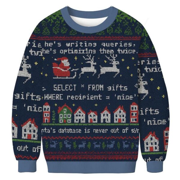 But beyond its whimsical design, the Santa’s Database Never Out of Sync Christmas Ugly Sweatshirt is more than just a piece of clothing. It’s a statement of your love for the holiday season, a symbol of your willingness to embrace the magic of Christmas with open arms. Imagine the smiles and laughter this sweatshirt will bring as you walk into a room, instantly becoming the life of the party. Whether you’re decking the halls or sipping hot cocoa with loved ones, this sweatshirt is sure to spark joy and create unforgettable memories during the most wonderful time of the year.
