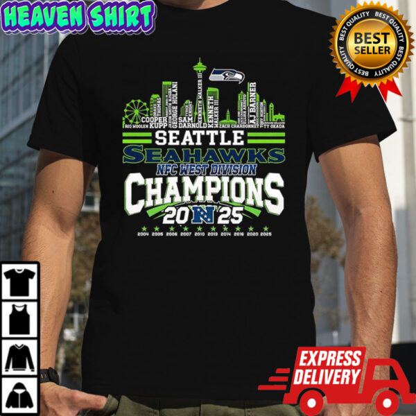 Seattle Seahawks NFC west Division Champions 2025 name player city skyline shirt, hoodie, sweater, longsleeve and ladies t-shirt