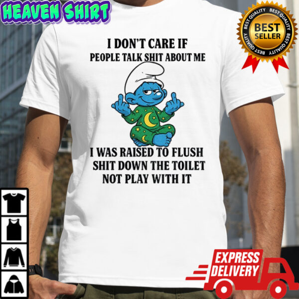 Express your bold attitude with our Smurf middle finger I don’t care if people talk shit about me I was raised to flush shit down the toilet shirt. This unique and edgy design is perfect for those who embrace their individuality and stand out from the crowd. Made from premium cotton, this shirt is not only comfortable but also a statement piece that exudes confidence and defiance. Let your clothing reflect your fearless spirit with this exclusive shirt that dares to be different.