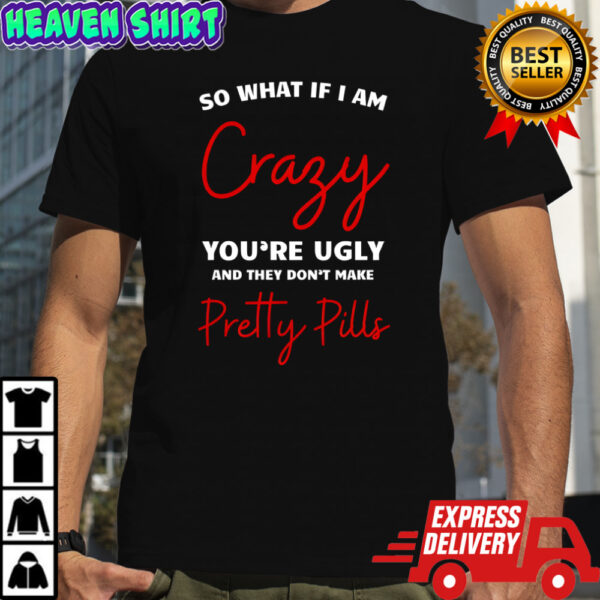 Unleash your bold and unapologetic style with our So what if i am crazy you’re ugly and they don’t make pretty pills shirt. This shirt isn’t just apparel; it’s a statement, a declaration of self-confidence that refuses to conform to society’s standards. Embrace your uniqueness and let your personality shine through with this eye-catching design. Crafted from premium quality fabric, this shirt offers both comfort and durability, ensuring that you feel as good as you look. Whether you’re out running errands or meeting friends for coffee, this shirt will be your go-to choice to stand out from the crowd.