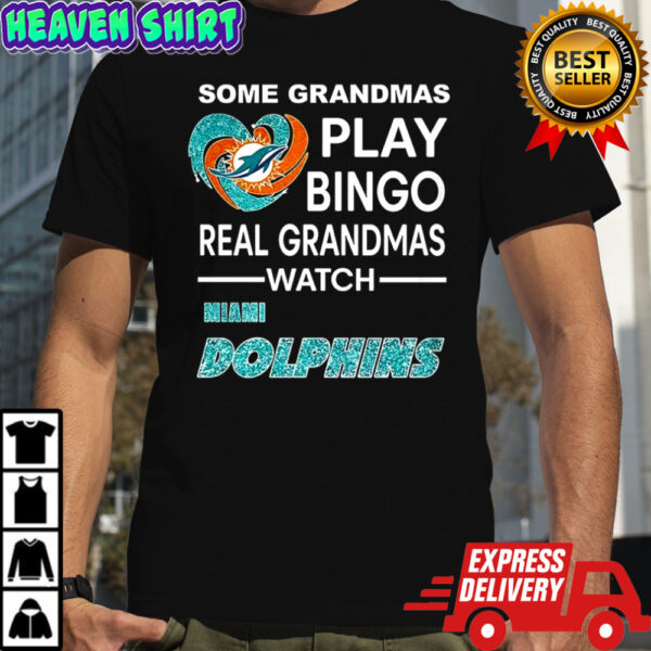 But this shirt is more than just sentimental value. Made with high-quality materials, it offers durability and style. The intricate design featuring a sparkling diamond heart showcases your passion for football with a touch of elegance. Whether you’re at the stadium or lounging at home, this shirt will make you stand out as a true fan. So, why settle for ordinary when you can have extraordinary? Embrace your unique style and dedication with the Some grandmas play bingo real grandmas watch Miami Dolphins football diamond heart shirt and let your love for family and football shine bright. Order now and wear your heart on your sleeve!