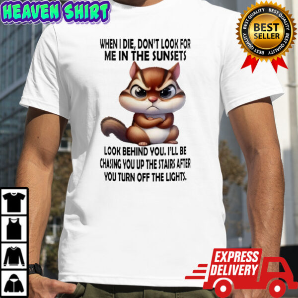 But this shirt is more than just a garment; it’s a symbol of everlasting love and cherished memories. Every stitch tells a story, every thread woven with the magic of unforgettable moments. So, embrace this Squirrel when i die don’t look for me in the sunsets look behind you i’ll be chasing you shirt as a token of our bond, a talisman of our unbreakable connection. Wear it with pride, knowing that I am forever with you, a silent guardian watching over you. Let this shirt be a beacon of hope, a touchstone of love that guides you through even the darkest nights. Purchase yours today and carry a piece of me with you wherever you go.