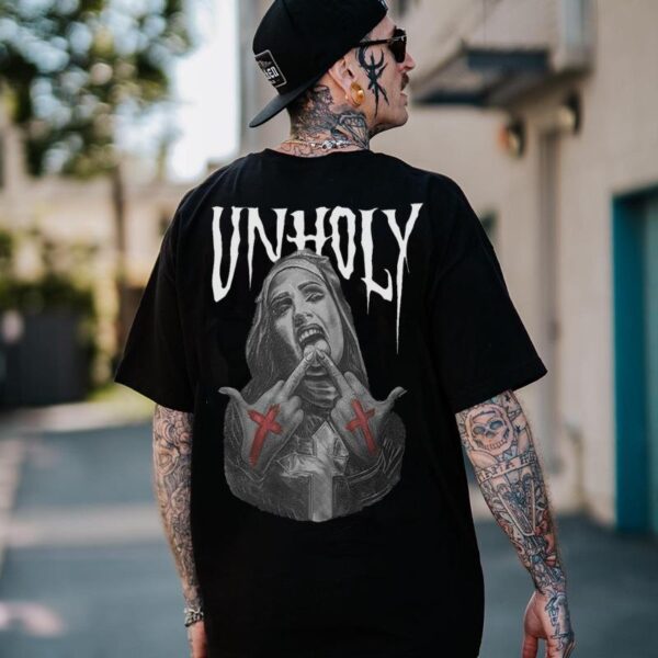 Dive into the rebellious spirit with the UNHOLY Defiant Nun Bad Religion Black Print T-shirt. This edgy piece isn’t your run-of-the-mill tee; it’s a bold statement that defies conventions. The design features a striking print of a defiant nun, challenging traditional norms and pushing boundaries. Perfect for those who dare to be different and stand out from the crowd, this shirt is a fusion of dark humor, anti-establishment vibes, and thought-provoking imagery. Whether you’re a trendsetter looking to make a statement or simply someone who appreciates unique fashion, this tee is bound to spark conversations and turn heads wherever you go.