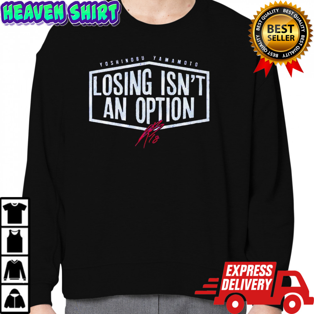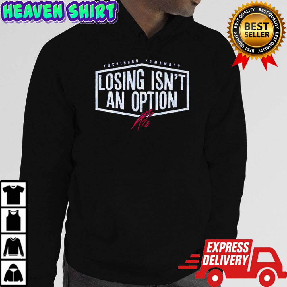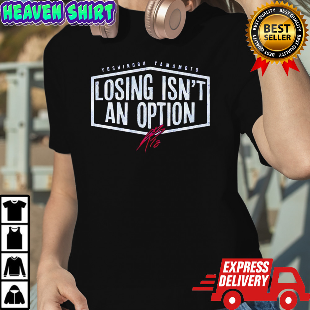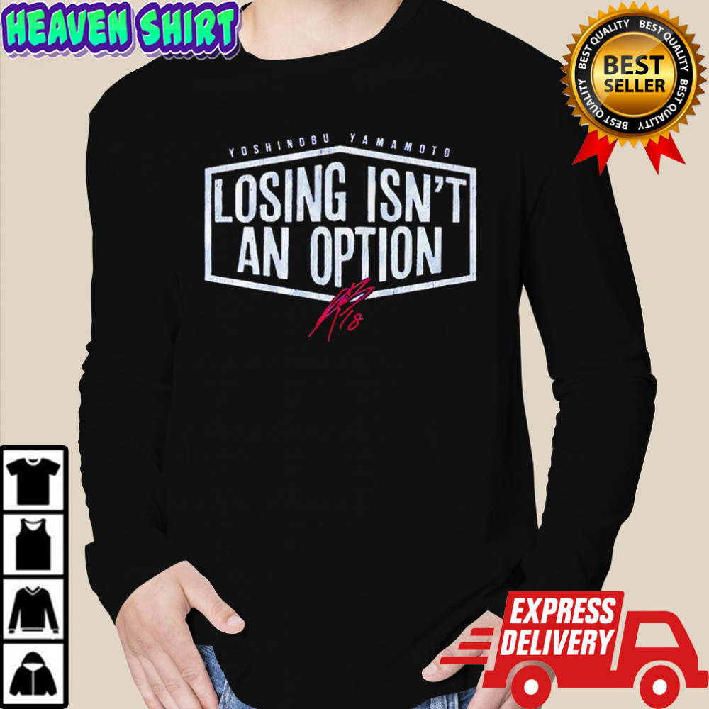 Embrace the winning spirit with the Yoshinobu Yamamoto Losing Isn’t an Option Los Angeles Dodgers signature shirt. Designed for true Dodgers fans who live and breathe the thrill of the game, this signature shirt embodies the essence of resilience and determination. Crafted with premium quality materials, this shirt delivers unparalleled comfort and durability, making it a must-have addition to your game day attire. The unique design celebrates the unwavering spirit of the Los Angeles Dodgers and pays homage to the legendary Yoshinobu Yamamoto, reminding you that giving up is never an option.